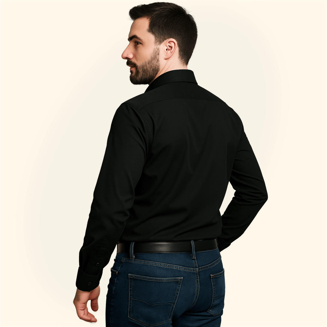 Sleek, sharp, and effortlessly sophisticated—this black formal shirt is the ultimate wardrobe essential. Its clean lines and smooth finish exude confidence and class. Whether paired with trousers for a formal event or worn casually with jeans, the shirt's versatility makes it a go-to piece.
